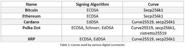 Как мы знаем, технология блокчейн является основой криптовалют. Подписи являются жизненно важной частью децентрализации и блокчейна. Это не ограничивается транзакциями, но необходимо в децентрализованных биржах, взаимодействующих и контрактах с несколькими подписями. Цифровые валюты, такие как Биткойн и Эфириум, используют алгоритм ECDSA, чтобы гарантировать, что только законный владелец может тратить средства. И Биткойн, и Эфириум используют стандартную эллиптическую кривую SECP256K1 с SHA256. В таблице 1 ниже перечислены кривые, используемые другими цифровыми валютами в технологии блокчейн. Дополнительную информацию о кривых, используемых другими цифровыми валютами, можно найти здесь .
