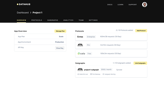 DataHub — это целостный инфраструктурный продукт Web3, позволяющий разработчикам управлять всеми RPC-соединениями своего приложения через единый интерфейс, мгновенно развертывать его на различных децентрализованных протоколах и получать доступ к аналитике. Со временем разработчики получат доступ к подграфам (The Graph), каналам оракула (Pyth), шлюзам хранения и решениям для данных.