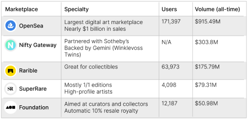 Торговля NFT происходит на торговых площадках, где можно делать покупки, покупать и перепродавать NFT. Некоторые торговые площадки специализируются на определенном типе активов (Axie Infinity, NBA Top Shot, CryptoPunks), в то время как другие предлагают все типы NFT. Взгляните на этот график крупнейших торговых площадок NFT за все время по объему: