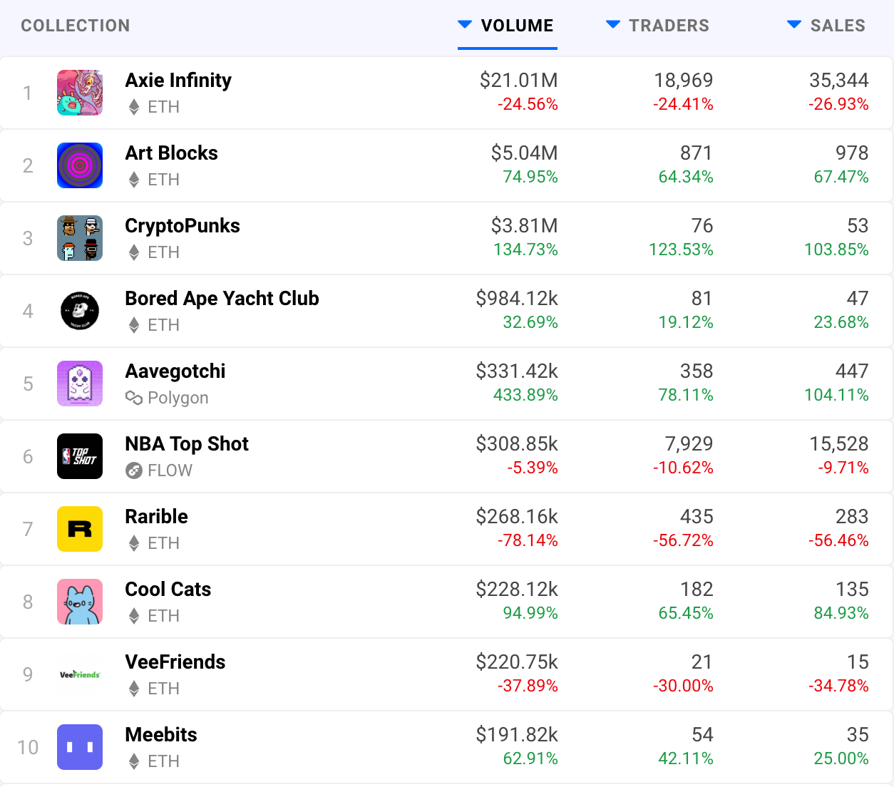 Этот общий рост составляет ряд известных коллекций NFT, каждая из которых имеет свой собственный рынок и цикл ажиотажа. Одними из самых популярных являются Axie Infinity (виртуальный мир, в котором пользователи могут владеть собственностью), CryptoPunks (пиксельные аватары персонажей) и NBA TopShot (виртуальные баскетбольные карточки и основные моменты).
