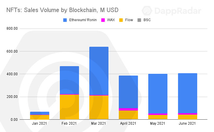 Это также по-прежнему один из самых горячих рынков сегодня. Согласно отраслевому отчету Dapp , объем торгов NFT вырос с менее чем 100 миллионов долларов в январе 2021 года до более чем 400 миллионов долларов в июне.