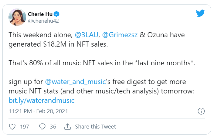 Американский диджей и известный поклонник NFT 3LAU продал свой альбом под названием 33 NFT за 11 миллионов долларов . Другие крупные музыканты, такие как Kings of Leon, Shawn Mendes и Ozuna, также выпустили проекты NFT . Известные визуальные художники, такие как Дэмиен Херст , также преобразовывали свои работы в NFT.