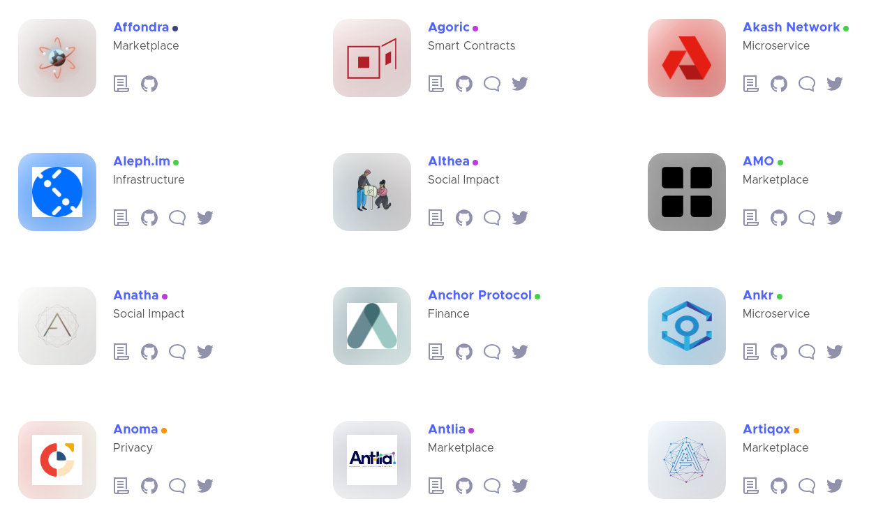 - Проекты DeFi Karura , Bifrost , Calamari , Basilisk , Altair и Heiko ;