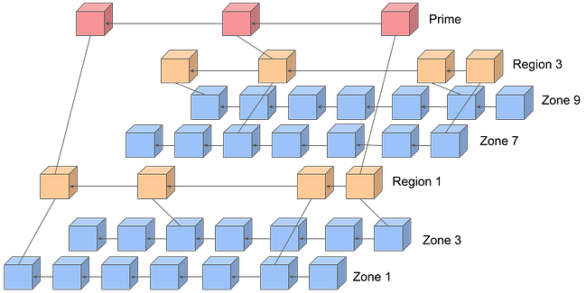 Quai Network существует в виде иерархической структуры, начиная с единственной Prime Chain, которую добывают все майнеры Quai Network. Основная цепь разделена на три цепочки регионов, каждая из которых разделена на три цепочки зон. Каждая из этих цепочек создает блоки асинхронно, а безопасность обеспечивается совпадающими блоками по всей иерархии.