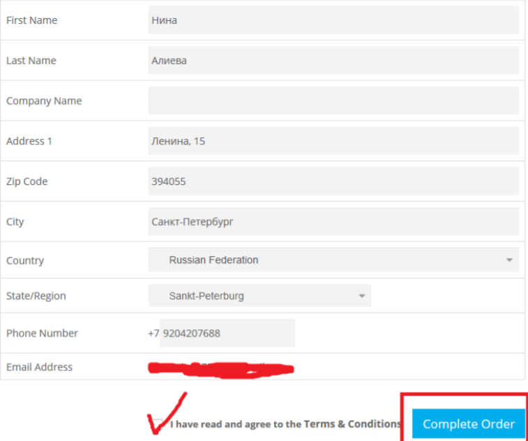 На следующей странице заполните анкету абсолютно любыми данными, это не важно. Поставьте галочку напротив «I have read and agree to the Terms & Conditions» и нажмите Complete Order.