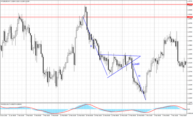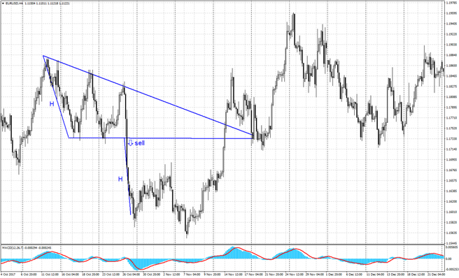 Универсальный паттерн "Треугольник", может предвещать как разворот, так и продолжение действующего тренда. Образуется между двумя сходящимися линиями поддержки и сопротивления. Рекомендуется вести торговлю в сторону пробития паттерна – если цена закрывается выше линии сопротивления – покупаем, если цена закрывается ниже линии поддержки – продаем. Цель отработки – величина основания паттерна (Н) в пунктах.