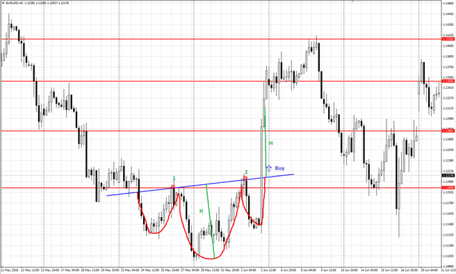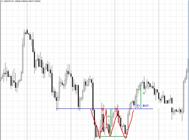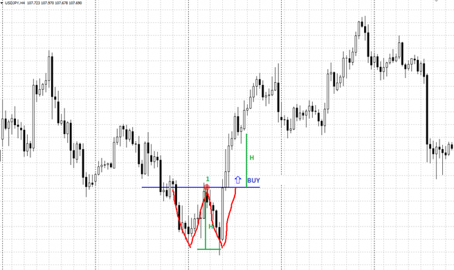 После этого ожидается рост цены как минимум на величину высоты фигуры, которая измеряется как расстояние в пунктах от минимума фигуры до линии шеи. Рекомендуются покупки либо сразу в ходе пробития линии основания фигуры, либо дождавшись отката к ней после пробития.