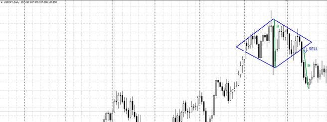 Если паттерн "Бриллиант" сформирован на максимумах графика в ходе восходящего тренда – рекомендуются продажи после закрытия цены ниже линии поддержки технической фигуры, цель отработки – высота паттерна (Н) в пунктах. Если "Бриллиант" сформирован на минимумах графика в ходе нисходящего тренда – рекомендуются покупки после закрытия цены выше линии сопротивления паттерна, цель отработки – высота паттерна (Н) в пунктах.