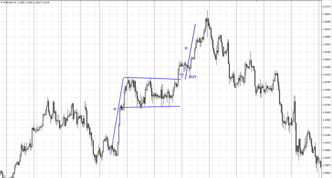 Зона коррекции паттерна "Флаг" может иметь вид "Прямоугольника", "Треугольника", "Клина". После завершения коррекции и закрытия цены выше линии сопротивления "полотнища флага" рекомендуются покупки, величина отработки – высота "древка флага" (Н).