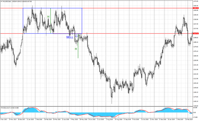 Универсальный паттерн "Прямоугольник", может предвещать как разворот, так и продолжение действующего тренда. Выглядит как боковой коридор, в котором консолидируется график цены, ограниченный горизонтальными уровнями поддержки и сопротивления. Рекомендуется вести торговлю в сторону пробития паттерна – если цена закрывается выше уровня сопротивления – покупаем, если цена закрывается ниже уровня поддержки – продаем. Цель отработки – высота паттерна (Н) в пунктах.