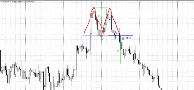 После этого ожидается снижение цены как минимум на величину высоты фигуры, которая измеряется как расстояние в пунктах от максимума фигуры до линии шеи. Рекомендуются продажи либо сразу в ходе пробития линии основания фигуры, либо дождавшись отката к ней после пробития.