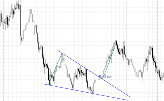 Если паттерн "Клин" сформирован на максимумах графика в ходе восходящего тренда – рекомендуются продажи после закрытия цены ниже линии поддержки, цель отработки – величина основания паттерна (Н) в пунктах. Если паттерн "Клин" сформирован на минимумах графика в ходе нисходящего тренда – рекомендуются покупки после закрытия цены выше линии сопротивления, цель отработки – величина основания паттерна (Н) в пунктах.