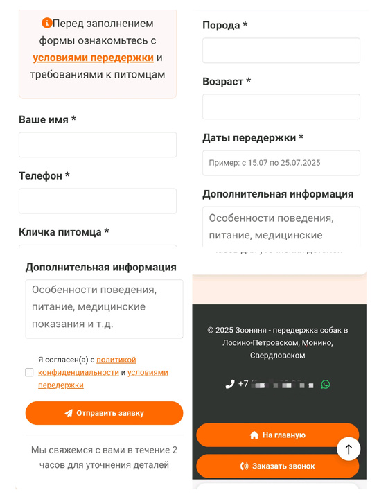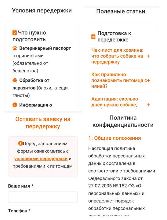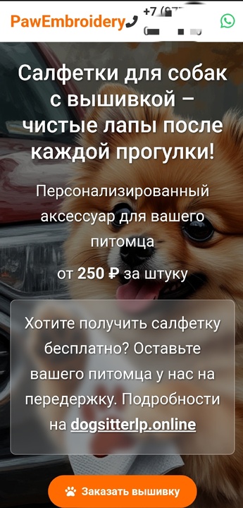 Сайт dogsitterlp.ru с салфетками остался одностраничным, но там так же можно подать заявку через почту и WhatsApp.