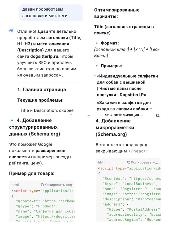 📂 Весь сайт по сути собирался в формате «спросил — получил — вставил». А наглядно это можно увидеть по скринам с вариантами диалогов с ИИ про SEO-оптимизацию. Там чётко видно, как он подсказывал нужные ключи, редактировал структуру, упрощал тексты и даже подбирал теги.