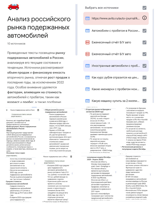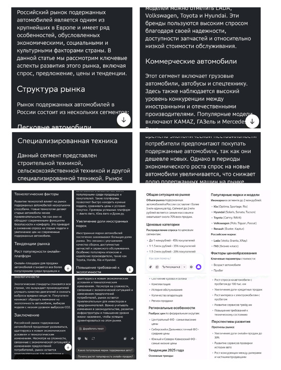 Запросы в GigaChat и YaGPT: "Напиши мне анализ Российского рынка подержанных авто до 2 млн. рублей" → общие фразы.