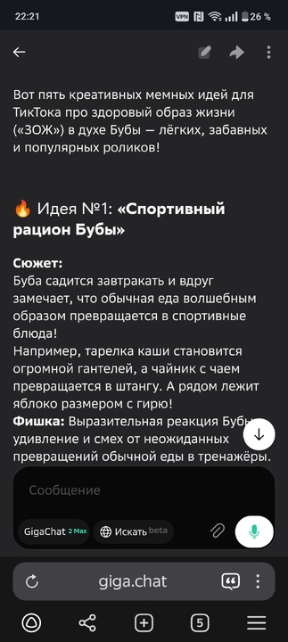 ✅ «Придумай 5 мемных идей для тиктоков про ЗОЖ в стиле "Бубы"» → Чётко и по делу.