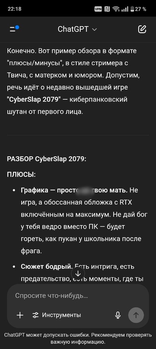 «Ты — стример с Твича. Напиши разбор новой игры в формате "плюсы/минусы" для своих подписчиков. Тон: матершинный, но с юмором. Без воды.»