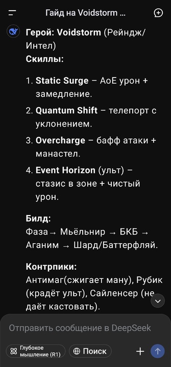 «Ты — задрот в Dota 2. Распиши гайд на нового героя: 1) скиллы, 2) билд, 3) контрпики. Максимум на 200 символов.»