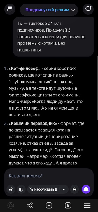 «Ты — тиктокер с 1 млн подписчиков. Придумай 3 залипательных идеи для роликов про мемы с котами. Без пошлятины.»