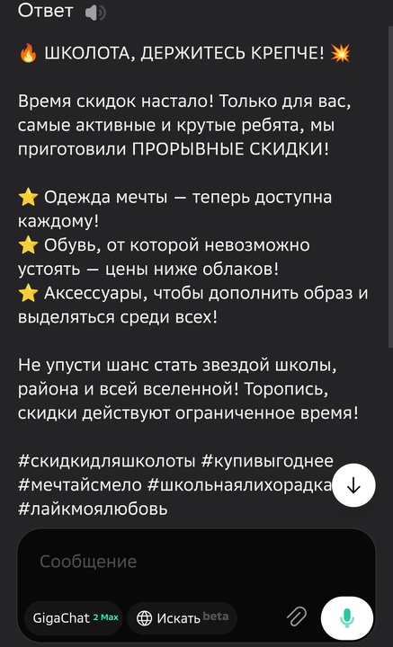 «Ты — маркетолог. Напиши пост для инсты про скидки, чтобы зашло школоте.»