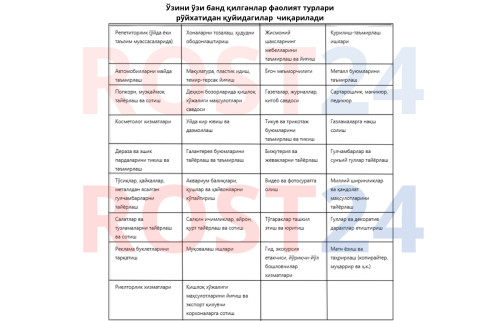 Ўзини ўзи банд қилганлар фаолият турлари қисқартирилмоқда