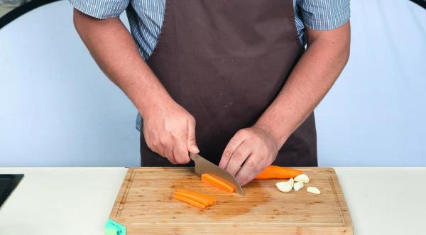 Начинаем с чистки чеснока и моркови. ⅔ чеснока и морковь нарезаются брусками.