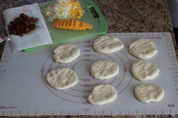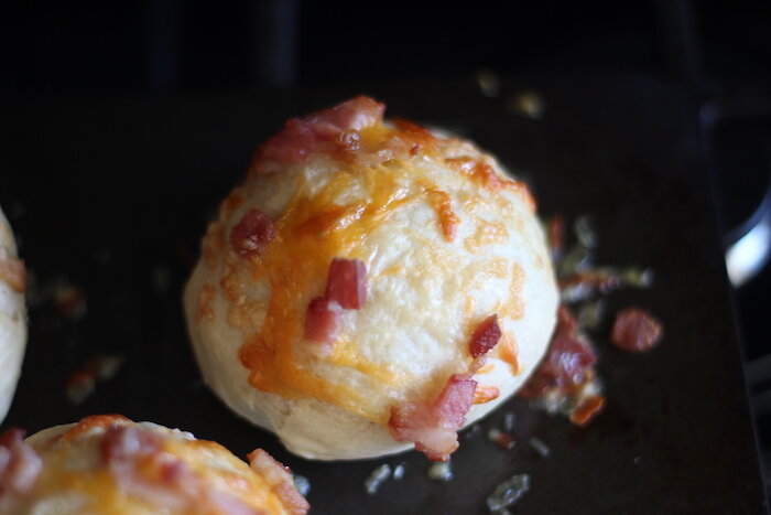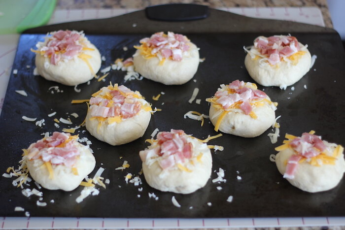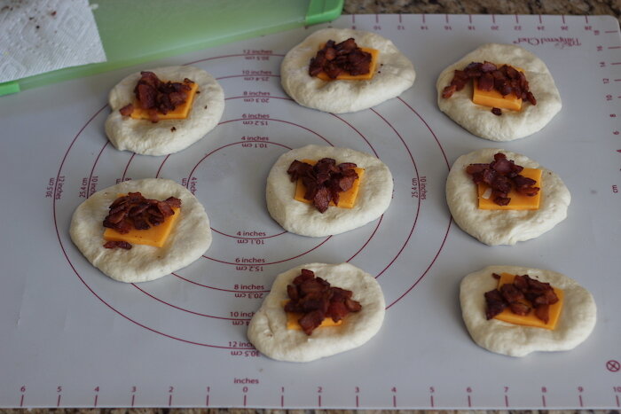 Как только вы это сделаете, вы можете добавить топпинг из бекона и сыра. Посыпьте на каждый рулет несколько кусочков сырого бекона (просто распределите его поровну между 8 рулетиками) и примерно 1 столовую ложку сыра.