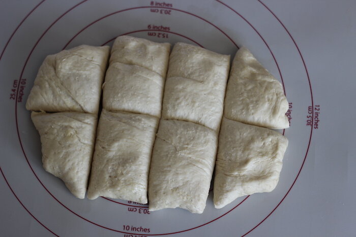 Как только тесто увеличится в два раза, переложите его на посыпанный мукой стол или коврик для выпечки Сгладьте его и сделайте прямоугольник размером примерно 15 х 20 сантиметров. С помощью ножа для пиццы разделите тесто на 8 частей.
