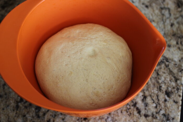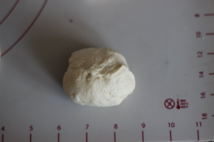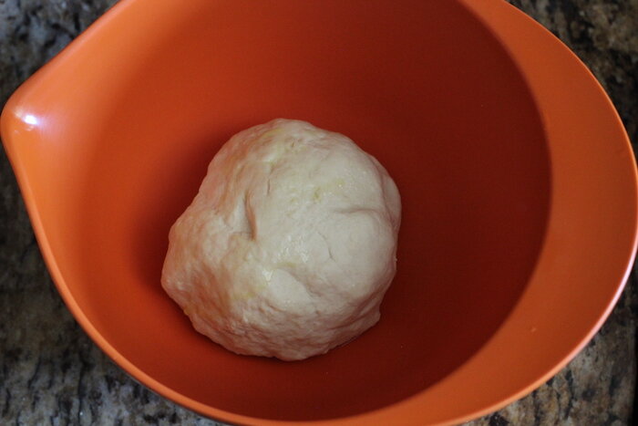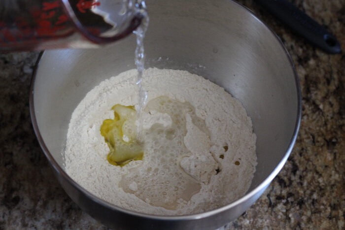 Добавьте воду и масло. Подсоедините чашу к миксеру и запустите крюк для теста на низкой скорости. Перемешивайте в течение нескольких минут, пока тесто не отстанет от стенок миски и не станет ровным и гладким. Если оно очень липкое, добавьте столовую ложку муки. Если тесто не собирается полностью, добавьте столовую ложку воды. Вы также можете сделать это вручную с помощью простой лопатки — хорошо перемешайте и вымесите, пока тесто не станет гладким.