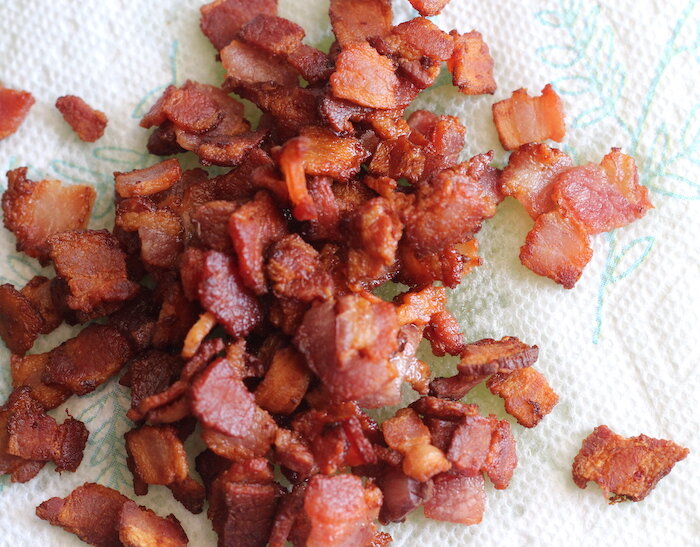 Пока тесто поднимается, приготовьте нарезанные кусочки из 4 ломтиков бекона и обжарьте их; Вы будете использовать этот бекон для начинки. (Оставьте сырые кусочки от двух других ломтиков, которые вы нарезали, для начинки.) Обжаривайте кусочки, пока они не станут темными и хрустящими. После приготовления отложите бекон на бумажное полотенце.