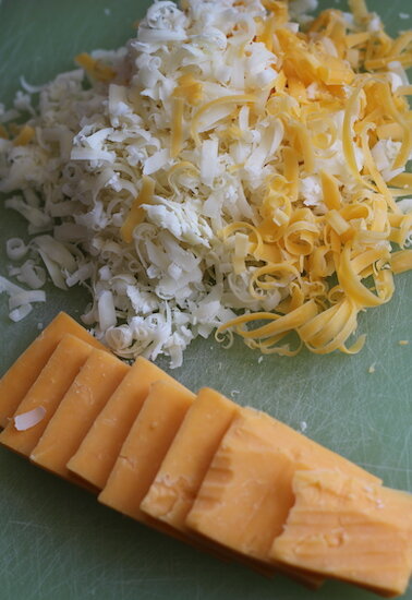 После того, как ваш бекон будет приготовлен, вы можете приготовить сыр, который вы будете использовать как для начинки, так и для топпинга. Внутри булочек вам понадобится 8 квадратов плавленого сыра. Используйте мягкий чеддер и сделайте их квадратными примерно 3-4 сантиметра и толщиной около полсантиметра. После того, как вы нарежете сыр для начинки, натрите 1/2 стакана острого чеддера для посыпки булочек (или отмерьте немного предварительно натертого сыра).