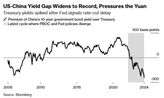 Премии по доходности государственных облигаций США по сравнению с их китайскими эквивалентами уже достигли рекордно высокого уровня, поскольку Китай борется с дефляцией, а цены в США растут.