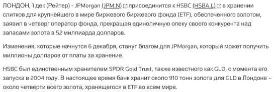 Почему 18 лет JPMorgan мог, но не хотел зарабатывать комиссию на самом крупном ETF, а в 2022 почему-то вдруг передумал? Почему половина физического золота перешла из хранилищ HSBC в JPM и более того: покинула Англию и направилась в Швейцарию и в США?