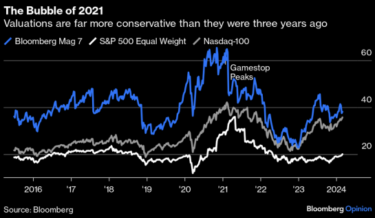 Каковы аргументы в пользу того, что это еще не пузырь? Всего три года назад оценка была гораздо более завышенной, достигнув своего пика во время безумия в отношении акций мемов. Как показывает диаграмма, акции «Великолепной семерки» и Nasdaq 100 тогда были гораздо более переоценными, чем сейчас. В настоящее ажиотаж консервативно сосредоточен на крупнейших компаниях с самыми большими прибылями. Если мы используем скользящую цену/прибыль в качестве индикатора, «Великолепная семерка» гораздо более тесно связана с более широким рынком, чем три года назад, а равновзвешенный S&P 500 по-прежнему выглядит намного дешевле: