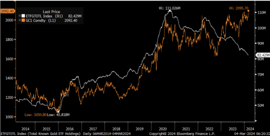 Рыжий - это цена золота, белый - притоки в ETF: