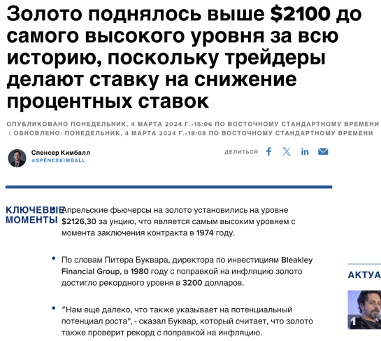 Однако далее Bloomberg признает, что в прошлую пятницу цена на золото закрылась на ИСТОРИЧЕСКОМ МАКСИМУМЕ. Просто никто не придал этому никакого значения, поскольку золото уже много раз тестировало $2100 и каждый раз неудачно...