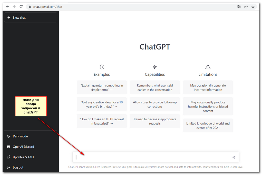 Поле для ввода запроса нейросети находится в нижней части кабинета.
