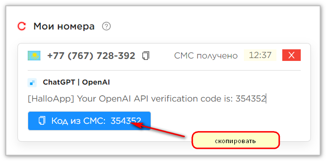 8. Вернитесь в личный кабинет onlinesim и скопируйте SMS, который отобразится под купленным номером телефона.