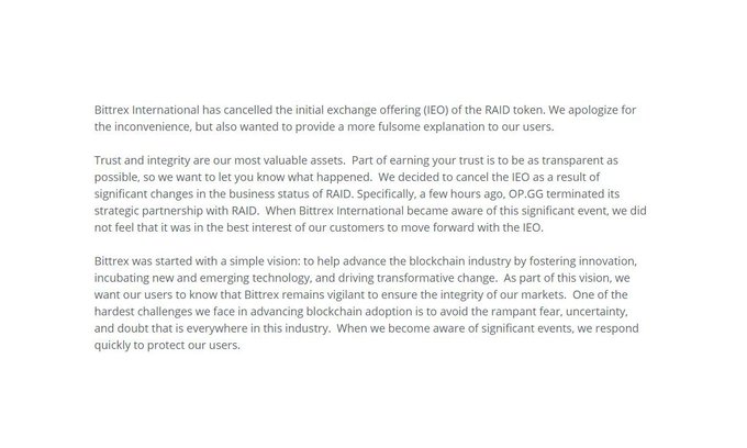 Bittrex International has cancelled the initial exchange offering (IEO) of the RAID token. We apologize for the inconvenience, but also wanted to provide a more fulsome explanation to our users. https://