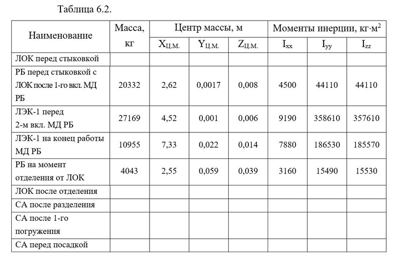 Масса комплекса на этапах полета приведена в таблице 4.2.