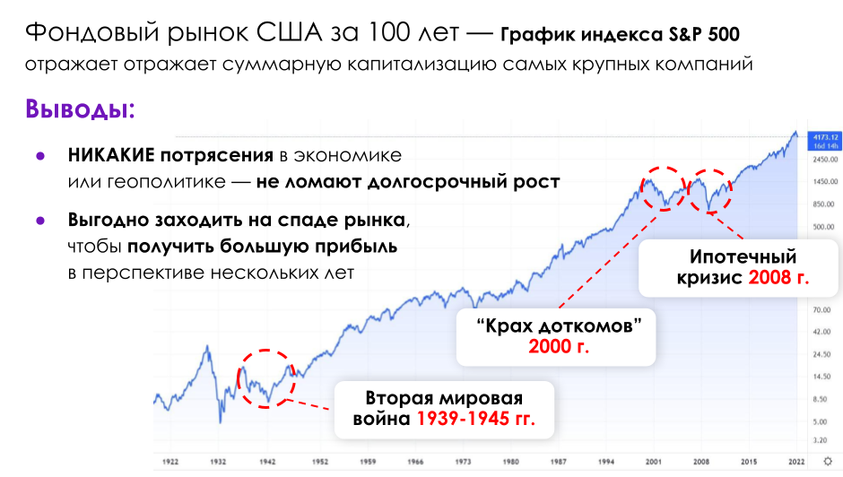 Пример этому — Рынок США, который, за последние 100 лет падал более 8 раз на фоне разных политических и экономических событий и после этого успешно восстанавливался и рос активнее