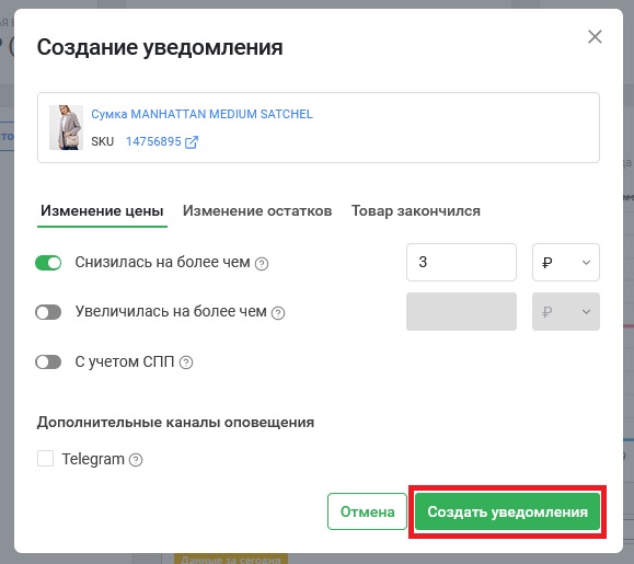 Выбери, какие изменения цены ты хочешь отслеживать.