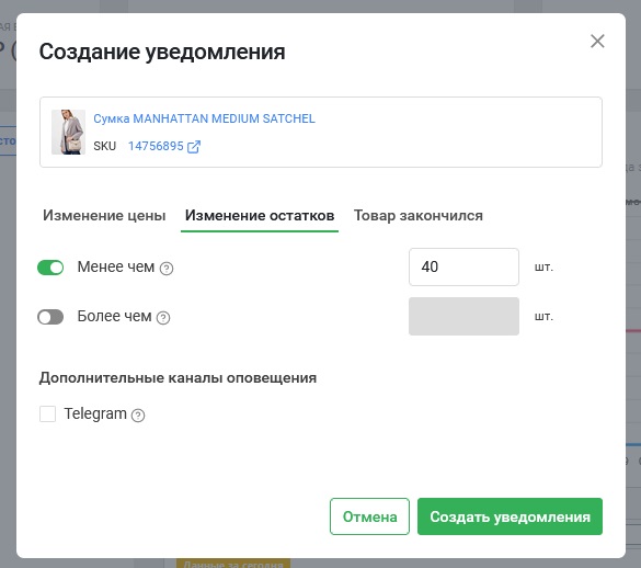 - Менее чем – если товара осталось меньше, чем ты укажешь, мы пришлем тебе уведомление. Например, если ты укажешь 40, мы пришлем уведомление, если товара будет 39 штук и меньше.