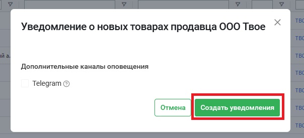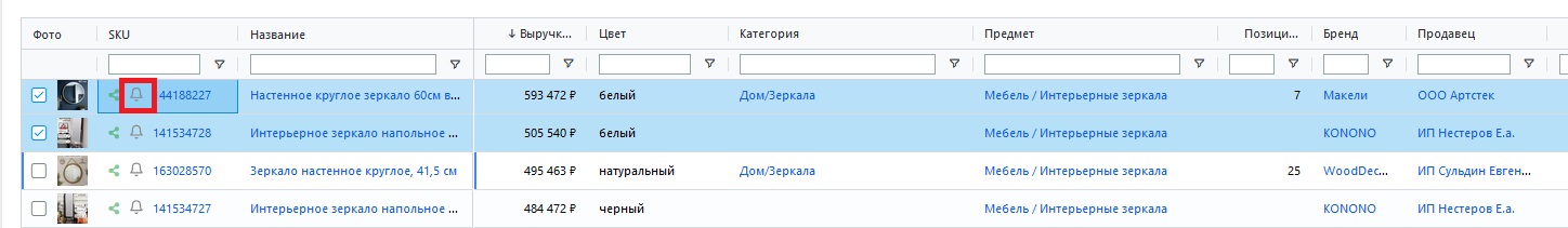 Можно получать уведомления от новых товарах продавца. Для этого перейди в Отчет по продавцам Wildberries или Отчет по продавцам Ozon, найди интересующего продавца и нажми на колокольчик.