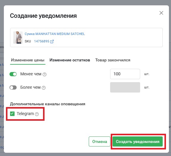 Поставь галочки на тех уведомлениях, которые хочешь получать через Telegram. И нажми Создать уведомления, чтобы сохранить настройки.