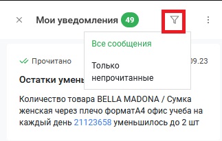 Здесь ты можешь отфильтровать их: смотреть все уведомления или только непрочитанные.