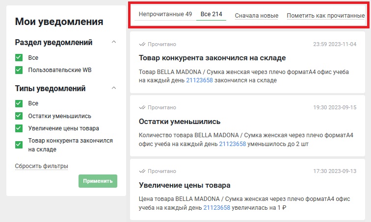 Ты можешь выбрать: отображать только новые уведомления или старые. Еще можно пометить все уведомления как прочитанные.