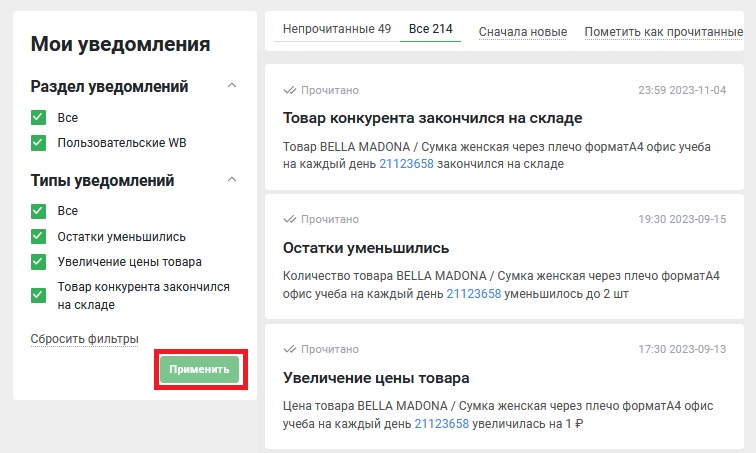 На вкладке Уведомления ты можешь отфильтровать уведомления. Настрой фильтры и нажми Применить.