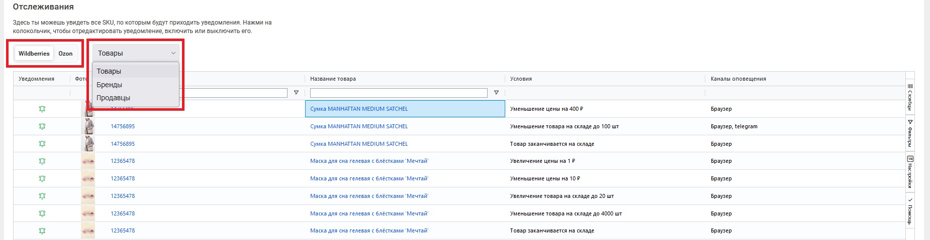 На вкладке Отслеживания ты можешь увидеть все SKU, бренды и продавцов, которые ты отслеживаешь.