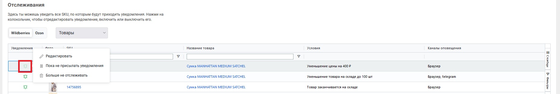 Или зайди в любой отчет Внешней аналитики WB или Внешней аналитики Ozon и нажми на колокольчик.